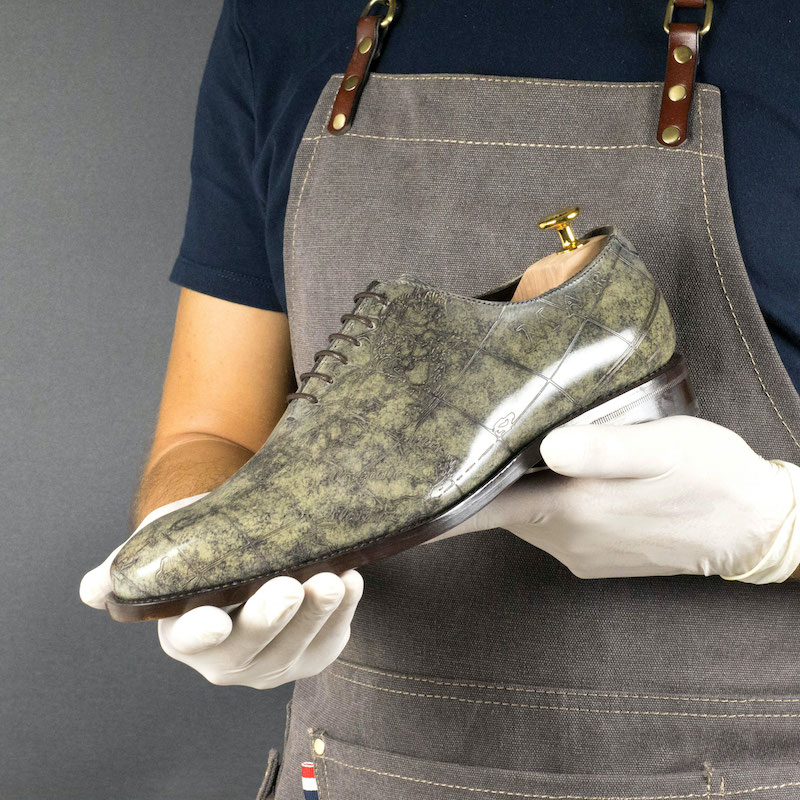 Goodyear welted pair of wholecut shoes, featuring an antique map illustration, which is laser engraved on the crust calf leather.