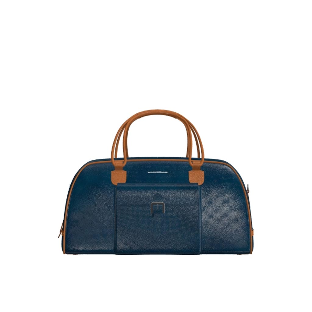 In this version, it’s made with navy blue and cognac painted full grain laetaher with niqel hardware.